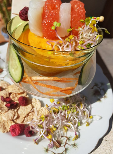 Serví en la parte superior el gazpacho de pomelo y como guarnición puse la brocheta de corvina y pomelo, acompañamos con unos brotes de rabanito para darle el toque picante.